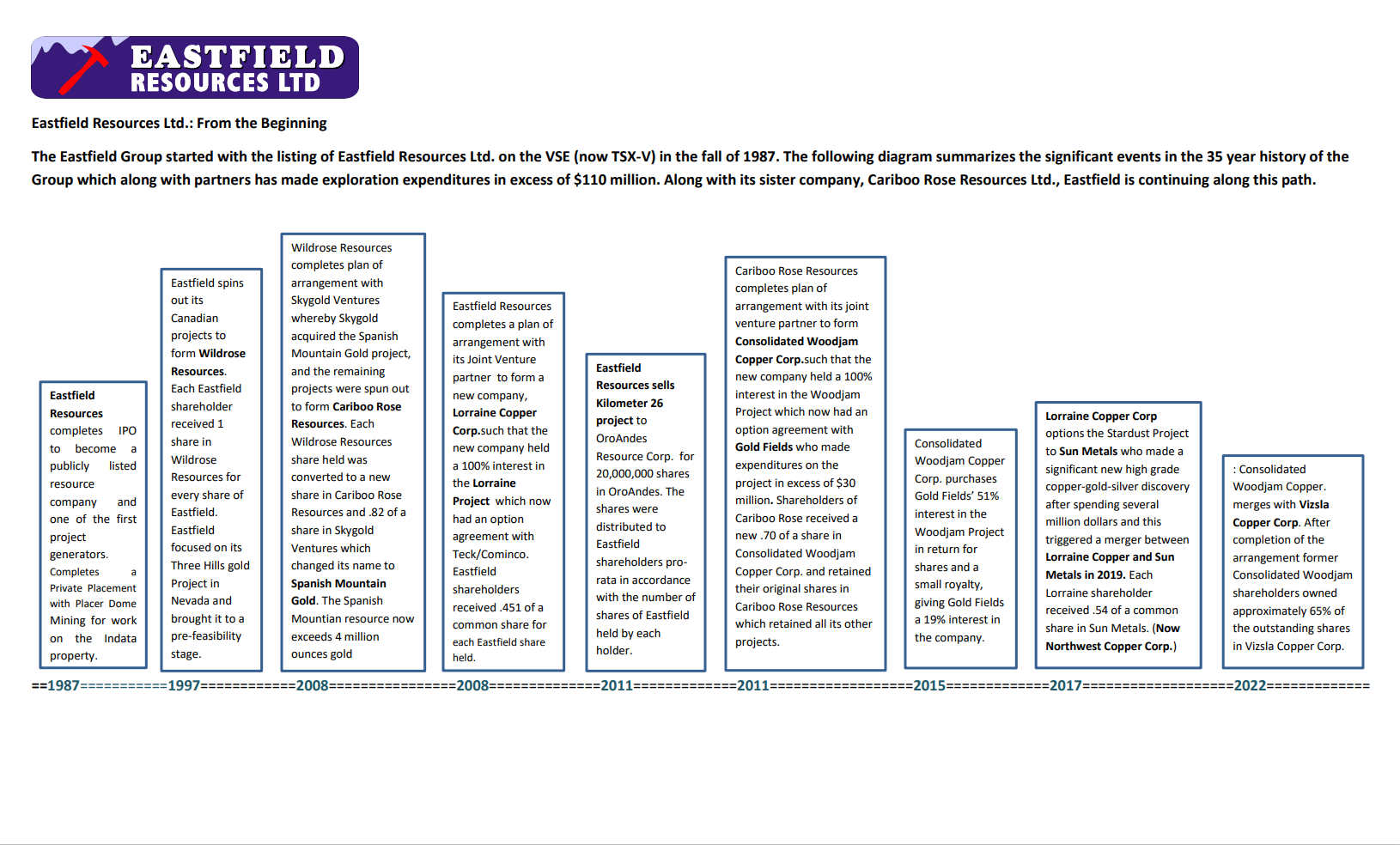 Eastfield has generated the majority of it's its cash flow internally without the need for regular dilutive financings. Over time, this strategy has also resulted in the spinout of 5 companies to the benefit of Eastfield shareholders, and the accumulation of several million shares in companies including Northwest Copper Corp., Consolidated Woodjam (Now Vizsla Copper, Alpha Copper Corp and others..