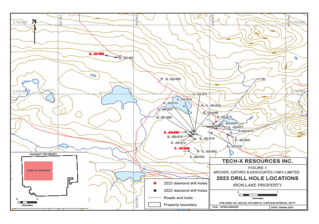 Tech-X Resources Inc. is a private company headed by Haig Farris with geological oversight provided by Jim Dawson. Tech-X may earn an 80% interest in the Iron Lake property by completing a total of $12,000,000 in work and paying a total of $730,000 in option payments by June 15, 2029. A 51% interest becomes earned following exploration expenditures of $4,000,000 and option payments of $230,000 by Dec 31, 2025. Twenty-three diamond drill holes were completed in 2022.