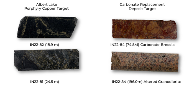 Additionally, the 2022 summer drill programme showed indications of CRD type mineralization in two separate areas in the northwest and southeast parts of the property. Molybdenum mineralization was encountered in two of the drill holes; IN22-74 and IN22-84. The northwest hole IN22-84 also encountered an extensive limestone breccia unit which has returned strongly anomalous lead-zinc-arsenic-antimony-(±gold) values from surface samples as well as the presence of manganese rich calcite, another indicator of the proximity of CRD mineralization.