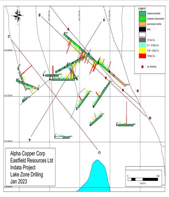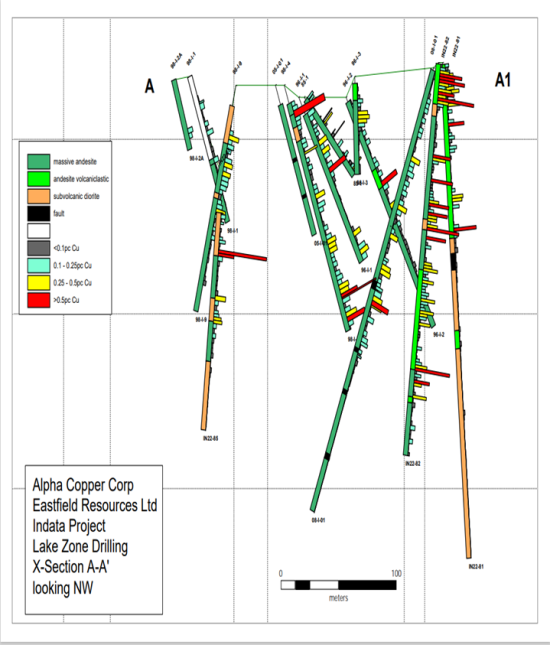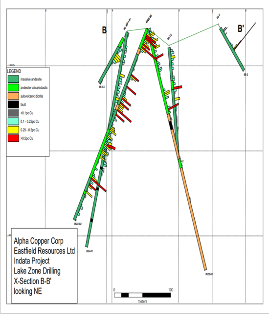 Vancouver, BC, Jan 23, 2023 Eastfield Resources Ltd. “Eastfield” (TSX-V: ETF) (OTC: ETFLF) and Option Partner Alpha Copper Corp “Alpha Copper” (CSE: ALCU) (OTC: ALCUF) (FSE: PP0) are pleased to review the results of 11 of 13 holes completed (2,140 meters) on the Indata project in the 2022 field season. Samples from the final two holes are currently in the lab being analyzed. Significant results from the program include hole IN22-82 drilled in the Lake Copper Zone and hole IN22-74 which discovered a previously unknown molybdenum mineralized system 5 kilometers to the south: