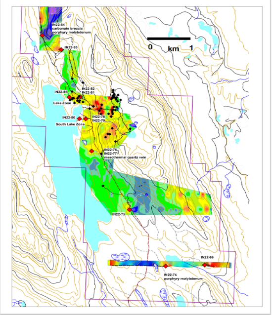Hole IN22-84; This hole tested a Carbonate Replacement Deposit (CRD) target located approximately 2 kilometers north of the Lake Copper Zone and 7 kilometers north of hole IN22-74. The hole intersected brecciated limestone to 71.3 m followed by weakly molybdenum mineralized granite (Mo values to 275 ppm) to the end of the hole at 246.6 m. The limestone was found to be consistently anomalous in the pathfinder elements arsenic and antimony with arsenic values to 402 ppm and antimony to 136 ppm. These results support the conclusion that this area, now named “the Dover Area” is permissive for both Carbonate Replacement Deposit (CRD) and Carbonate Hosted Precious Metal styles of mineralization.