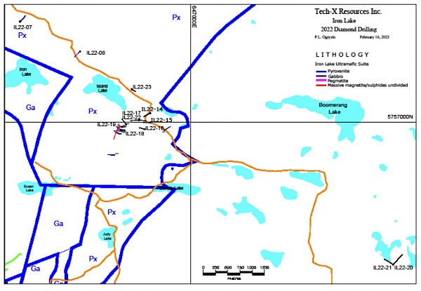 Hole IL22-07 (results previously announced) located approximately 3 kilometers northwest of hole IL22-18 encountered low grade nickel mineralization including 0.12% over 2.0 meters and 0.10% over 6.9 meters. A very large and strongly conductive zone detected in the 2021 MMT airborne (magnetotelluric) survey underlies this hole at depth suggesting that this mineralization may be leakage from a deeper massive sulphide source. In response to these and other encouraging results Tech-X has advised Eastfield that early in the 2023 season it will commission a VTEM (Versatile Time Domain Electromagnetic) helicopter borne geophysical survey.