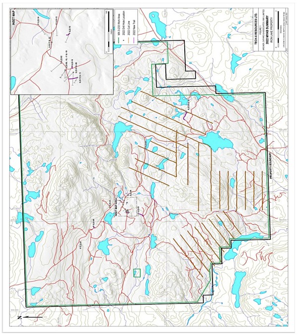 Indata: copper-gold- (molybdenum) porphyry and precious metal quartz vein, located 120 km north of Fort St. James, BC, optioned to Alpha Copper Corp who may earn 60% by completing $2,000,000 in exploration and paying $450,000 (cash and/or shares) by June 20, 2023. Eleven drill holes totalling 2,140 m were completed in 2022. Results include IN22-82 with 173.6 meters grading 0.23% copper starting at 2.9 meters including 28.9 meters grading 0.47% copper starting at 2.9 meters. It constitutes the northern boundary of the Lake Zone which remains open beyond this point. A new zone of molybdenum mineralization was unexpectedly discovered 5 kilometers to the south of the Lake Zone in what is now called “Area 74” where hole IN22-74 intersected 30.8 meters grading 0.10% molybdenum (0.16 MoS2 eq.) starting at 113.7 meters and continuing to the bottom of the hole including 7.5 meters grading 0.32% molybdenum (0.51% MoS2 eq.). Results from historical drilling at Indata include DDH88-11 with 4.0 meters grading 47.26 g/t gold. In 2019 new mineralization was exposed by logging activities in the southern region of the claims with samples returning up to 3.64% copper and 5.95 g/t gold. The Kwanika and Stardust deposits, owned by Northwest Copper Corp., are located immediately north of Indata and share similar geology.