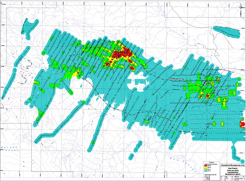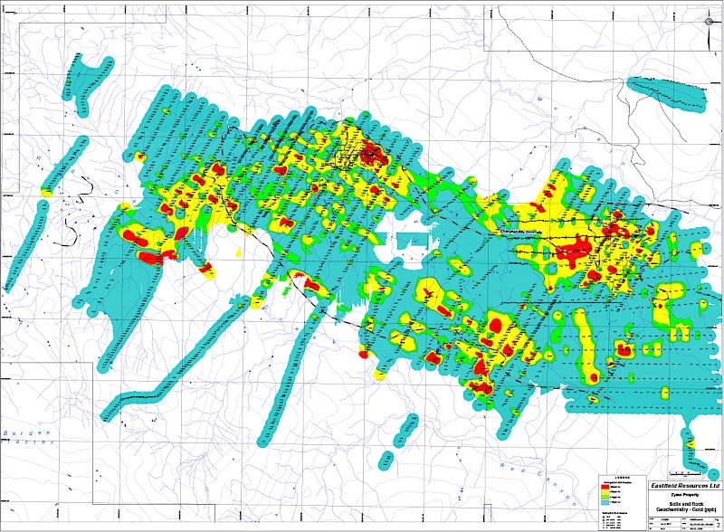 The first noted discovery of mineralization in the Zymo Ridge area was by Corona Corporation in 1987 while following up a government regional geochemical survey gold anomaly on Red Canyon Creek. They noted anomalous gold values in a quartz-sericite-pyrite altered intrusion. Small programs in 1990-1 and 1996-7-8 were largely geochemical sampling programs including stream sediment, rock sampling, and the emplacement of a soil grid.
