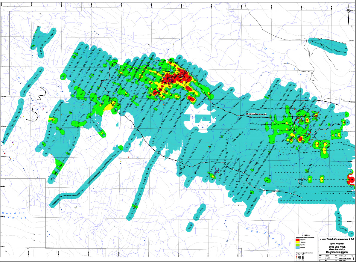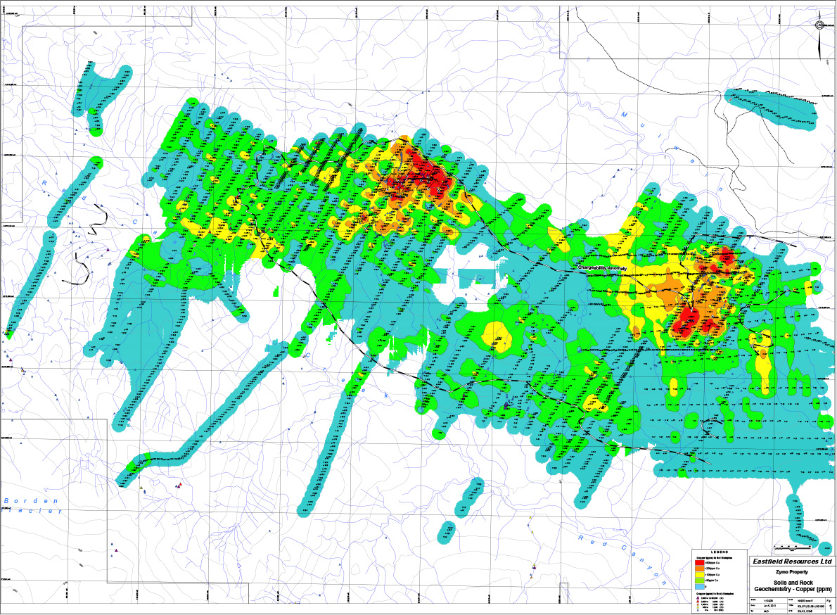 The Zymo property hosts at least two large copper-gold porphyry, intrusion-related, mineralized zones known as the Hobbes zone and the FM zone. Other areas of interest are the untested RD zone and URC zone which have an unexplained gold soil anomalies with coincident geophysical anomalies (magnetic high and IP high).There still remains potential for adding new targets.