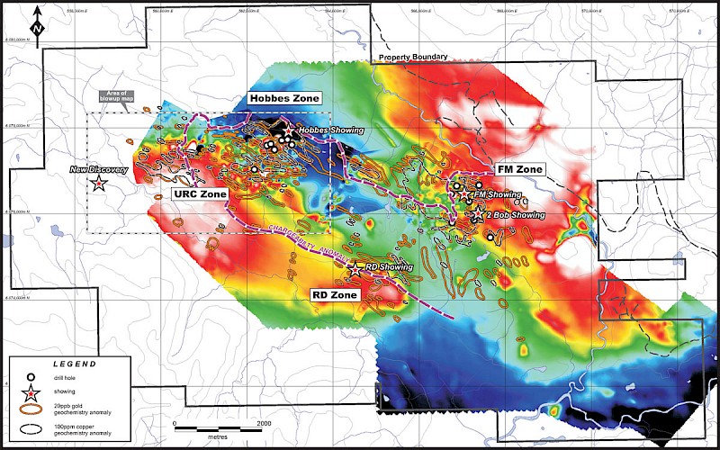Reconnaissance exploration to the west of previous exploration resulted in the discovery of significant float of strongly altered and well mineralized intrusive rock that returned 0.74 % copper and 0.70 g/t gold. The sample was taken approximately 1.5 km west of the URC target and indicates a new target area. The sample carries abundant magnetite which is characteristic of the strongly mineralized Hobbes Zone 4 km to the east.