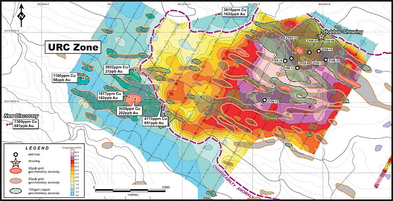 At URC, drill hole ZY11-24 intercepted unaltered sediments. The large 200 metre by 1,500 metre copper and gold soil anomaly and coincident geophysical anomalies (magnetic high and IP high) at URC are unexplained and the URC target remains largely untested. A second hole collared on the target was lost in overburden.