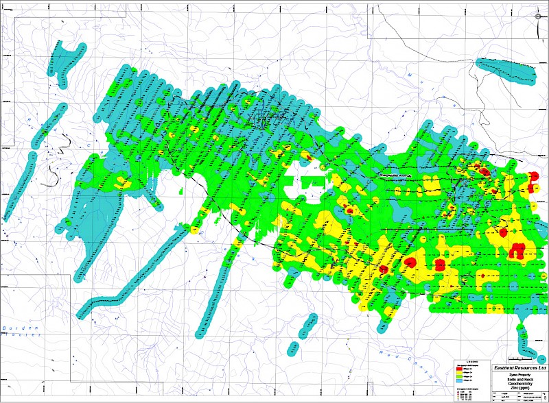 An 823 line-kilometre airborne geophysical survey was completed in December 2004 by NDT Ventures Ltd.